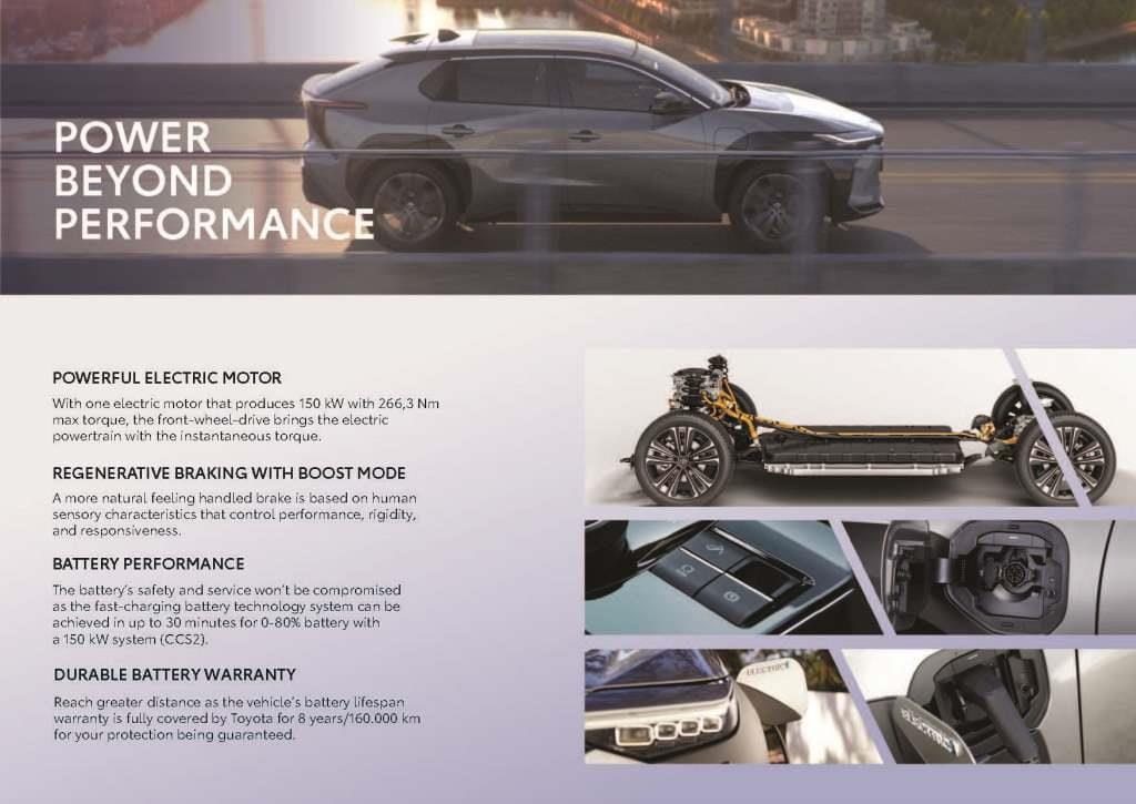 Untuk akselerasi dari 0-100 km/jam hanya membutuhkan waktu 8,3 detik saja, menjadikan Toyota bZ4X kendaraan listrik dengan performa yang sangat tangguh. Ada juga teknologi Regenerative Braking with Boost Mode yang akan memberikan kontrol akan performa yang responsif.