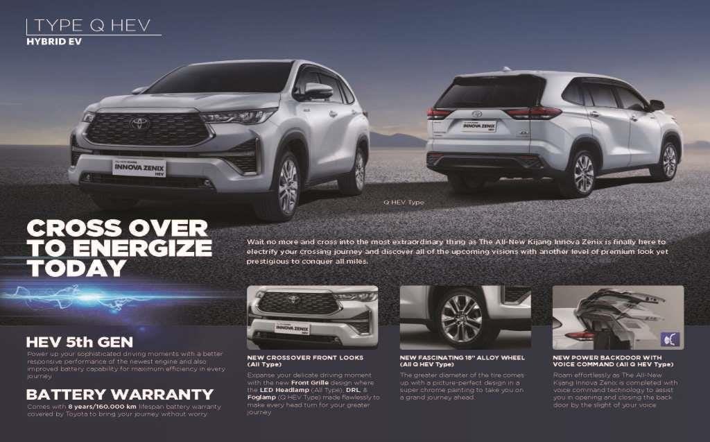 Saatnya menyebrang dengan energi baru The All-New Kijang Innova Zenix yang hadir dengan full model change yang membuat Anda bisa melintas kemana saja dan melampaui batasan apapun. Dengan Teknologi Hybrid baru, Fitur Canggih, desain Crossover dan Fitur Keselamatan, akan menjanjikan Anda kenyamanan, jaminan dan ketangguhan dalam setiap perjalanan indah ke depan.